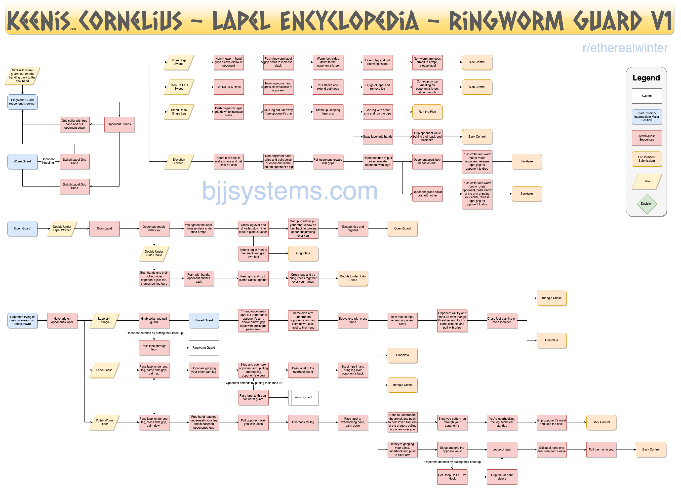 I just finished watching the Ringworm Guard chapter of Keenis’ Lapel Encyclopedia and is it the perfect follow up chapter to the Worm Guard (linked is the worm guard flowchart). I was finding after a while that all my usual sparring partners were just sitting down and denying/making it difficult for me to either sweep from Worm Guard or making it difficult for me to pass the lapel to even get to the position.